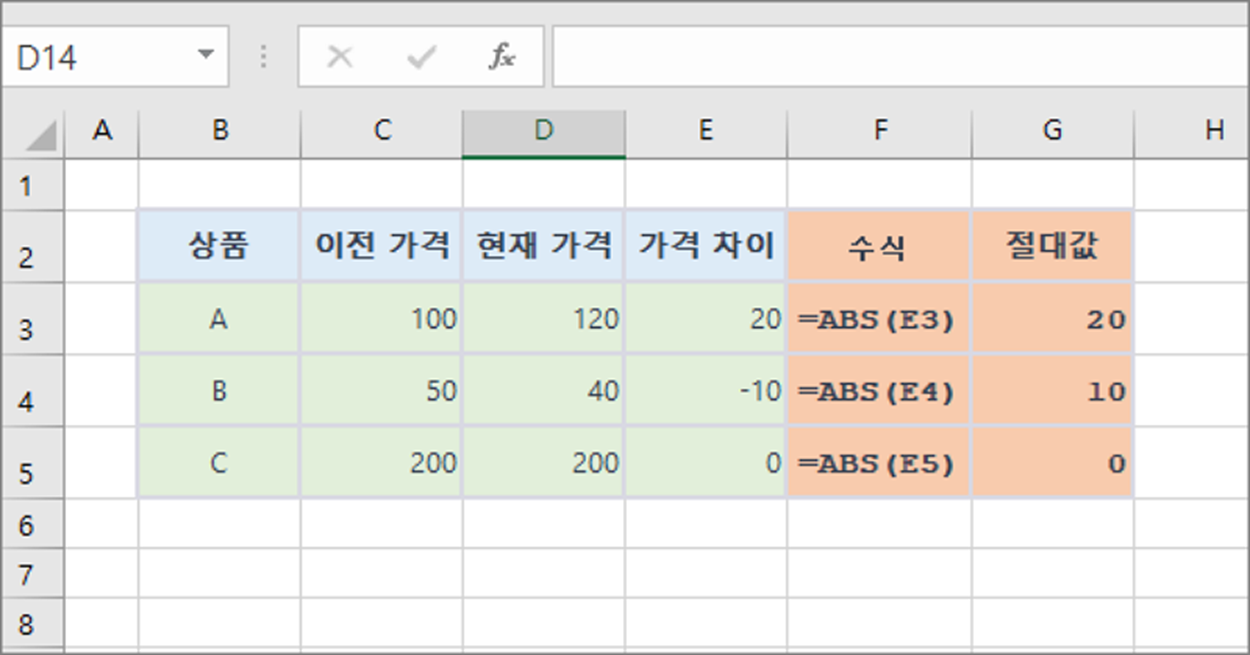 ▼ 상품의 가격 변동을 분석할 때, 가격 차이의 크기를 알고 싶습니다. 아래 표는 상품 가격 변동을 보여줍니다. 가격 차이의 절대값을 계산하여 변동의 크기를 확인합니다.