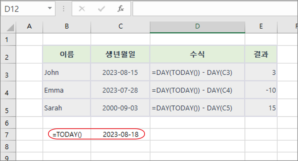아래 예제에서는 'DAY' 함수를 사용하여 생일로부터 오늘까지 몇 일이 지났는지를 계산합니다. 각 행에서 이름과 생년월일 데이터가 주어지고, 'TODAY' 함수로 현재 날짜를 얻은 후 'DAY' 함수를 사용하여 생일로부터 몇 일이 지났는지 계산합니다.