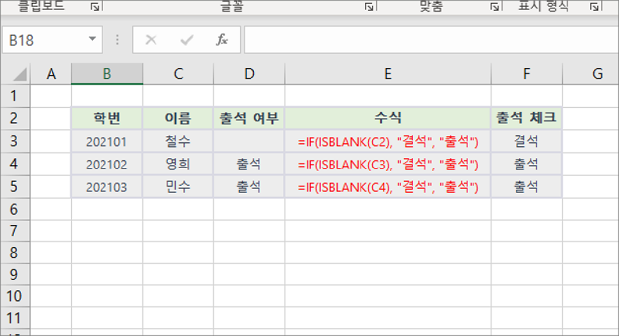 | =IF(ISBLANK(C2), "결석", "출석") |