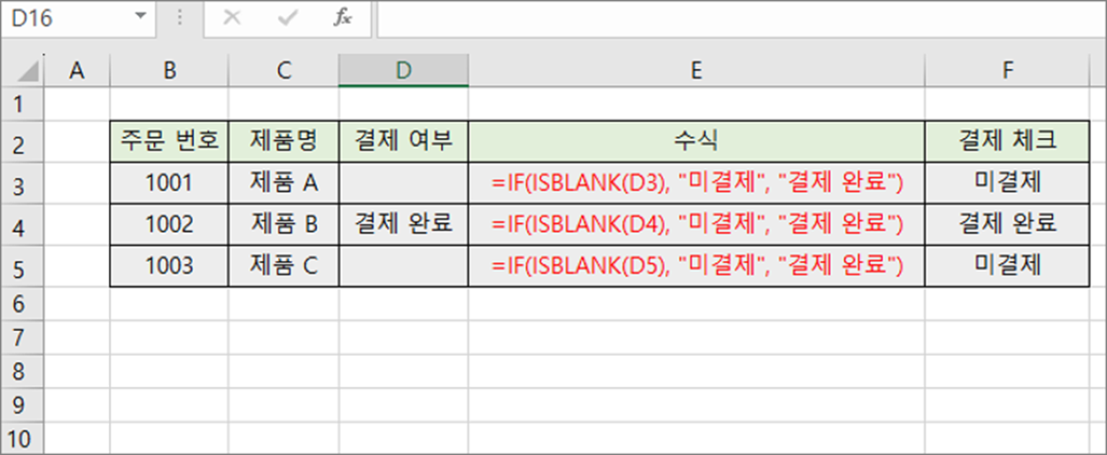 | =IF(ISBLANK(C2), "미결제", "결제 완료") |
