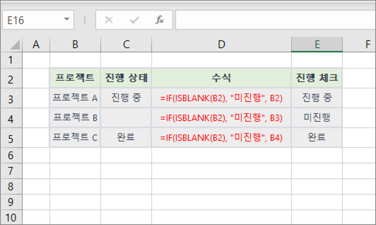 아래 표는 프로젝트의 진행 상태를 보여줍니다. IF 함수와 ISBLANK 함수를 활용하여 진행 상태를 확인하는 예제입니다. 수식은 B2 셀이 비어 있으면 "미진행", 데이터로 채워져 있으면 해당 진행 상태를 반환합니다.