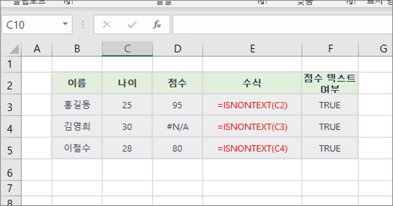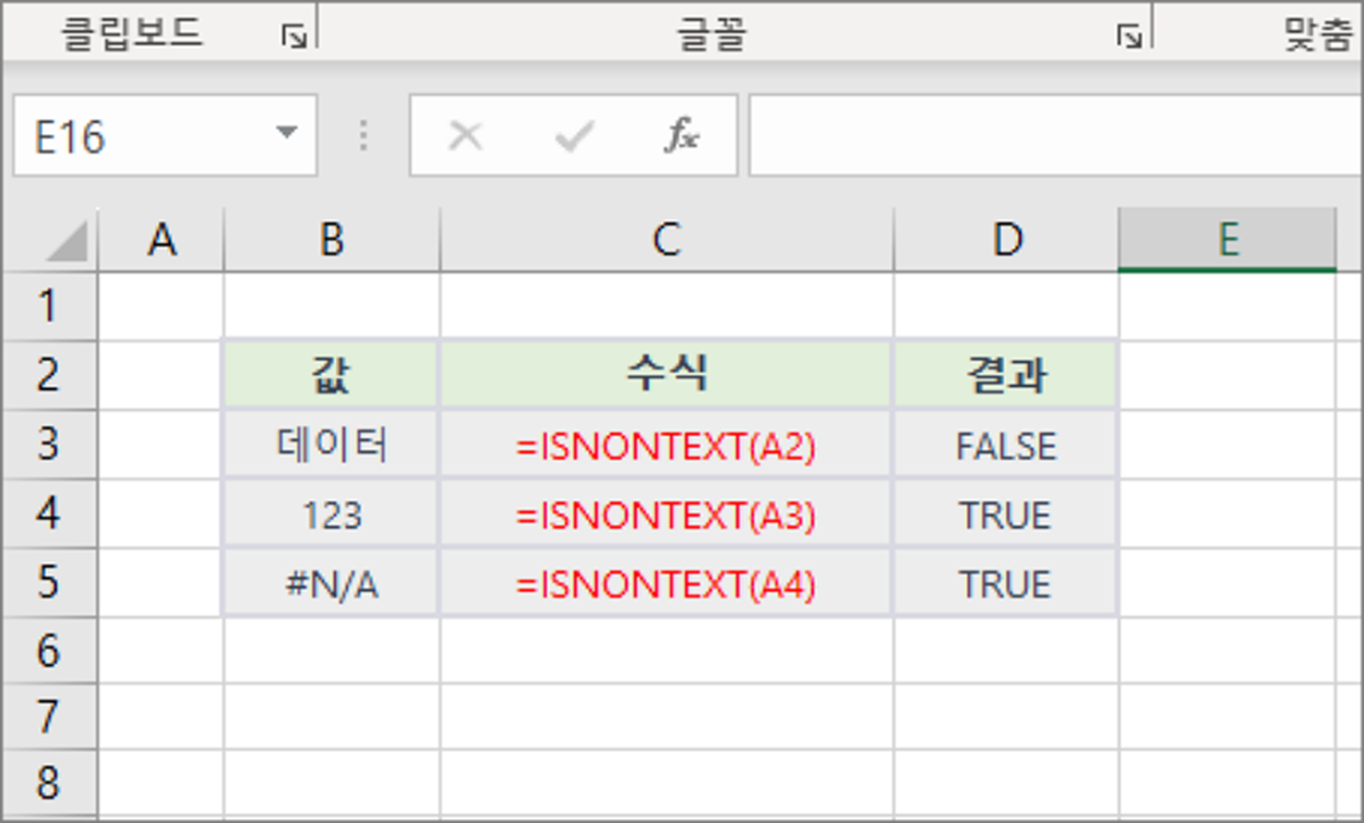 | =ISNONTEXT(값) l 값 : 확인하고자 하는 값 또는 셀 참조 |