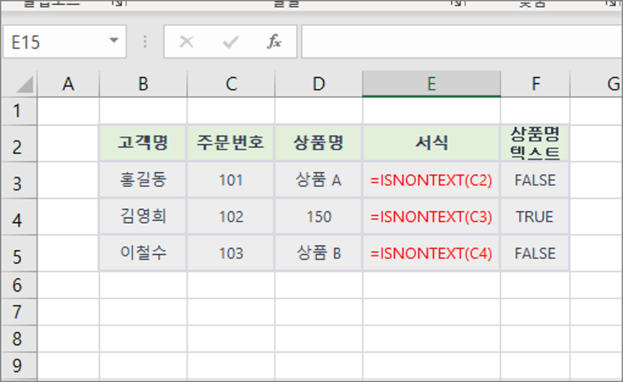 아래 샘플에서는 'ISNONTEXT' 함수를 사용하여 주문 상품명이 텍스트가 아닌 경우를 확인합니다. 수식은 다음과 같습니다. ISNONTEXT 함수는 C3 셀에 있는 값이 텍스트가 아닌 경우 `TRUE`를 반환하고, 그렇지 않으면 `FALSE`를 반환합니다.