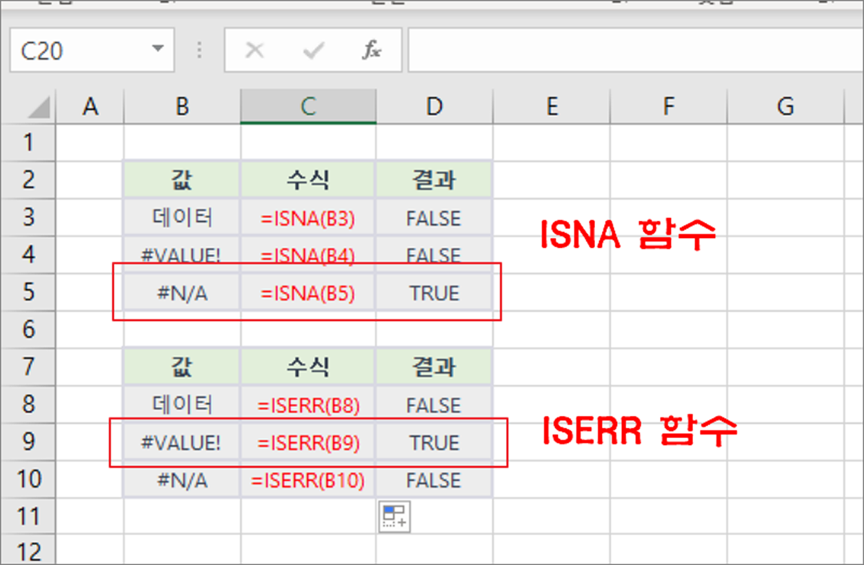 'ISNA' 함수는 주어진 값이 #N/A 오류인지를 판단하는 함수입니다. 반면에 'ISERR' 함수는 #N/A 오류를 제외한 모든 에러 유형을 판단합니다. 둘 모두 데이터 처리 시 에러를 감지하기 위해 사용합니다. 그림처럼 ISERR 함수는 #N/A 함수를 감지하지 못하기 때문에 ISNA 를 사용해야 합니다.