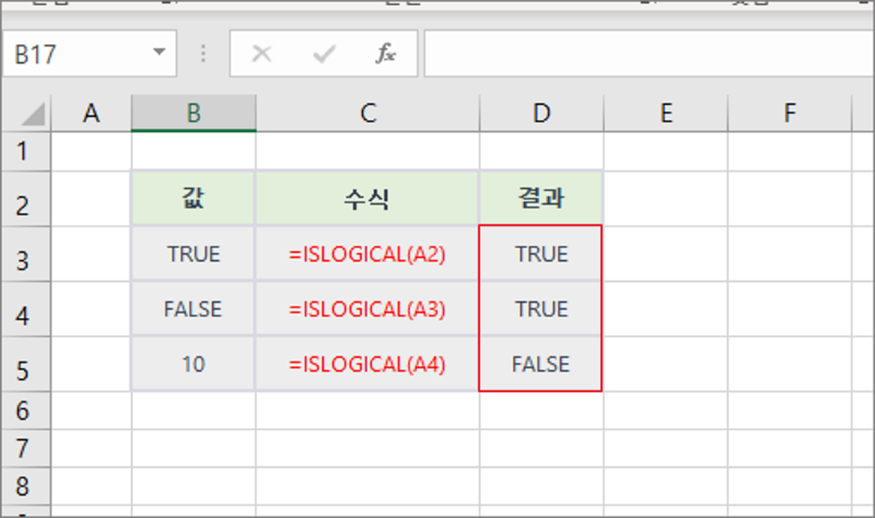 | =ISLOGICAL(값) l 값: 확인하고자 하는 값 또는 셀 참조 |