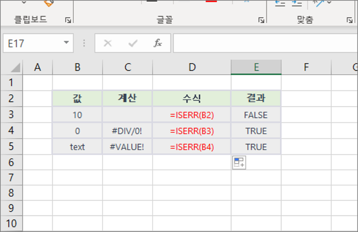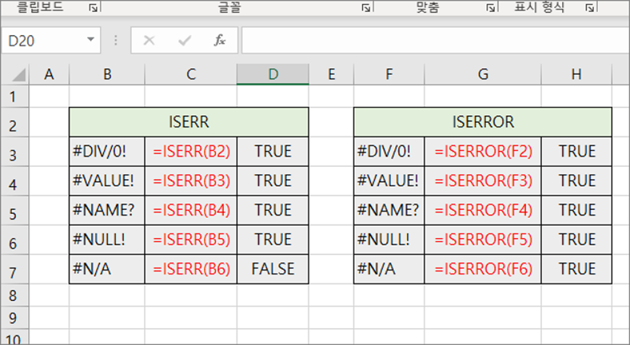 | =ISERR(값) l 값 : 확인하고자 하는 값 또는 셀 참조 |