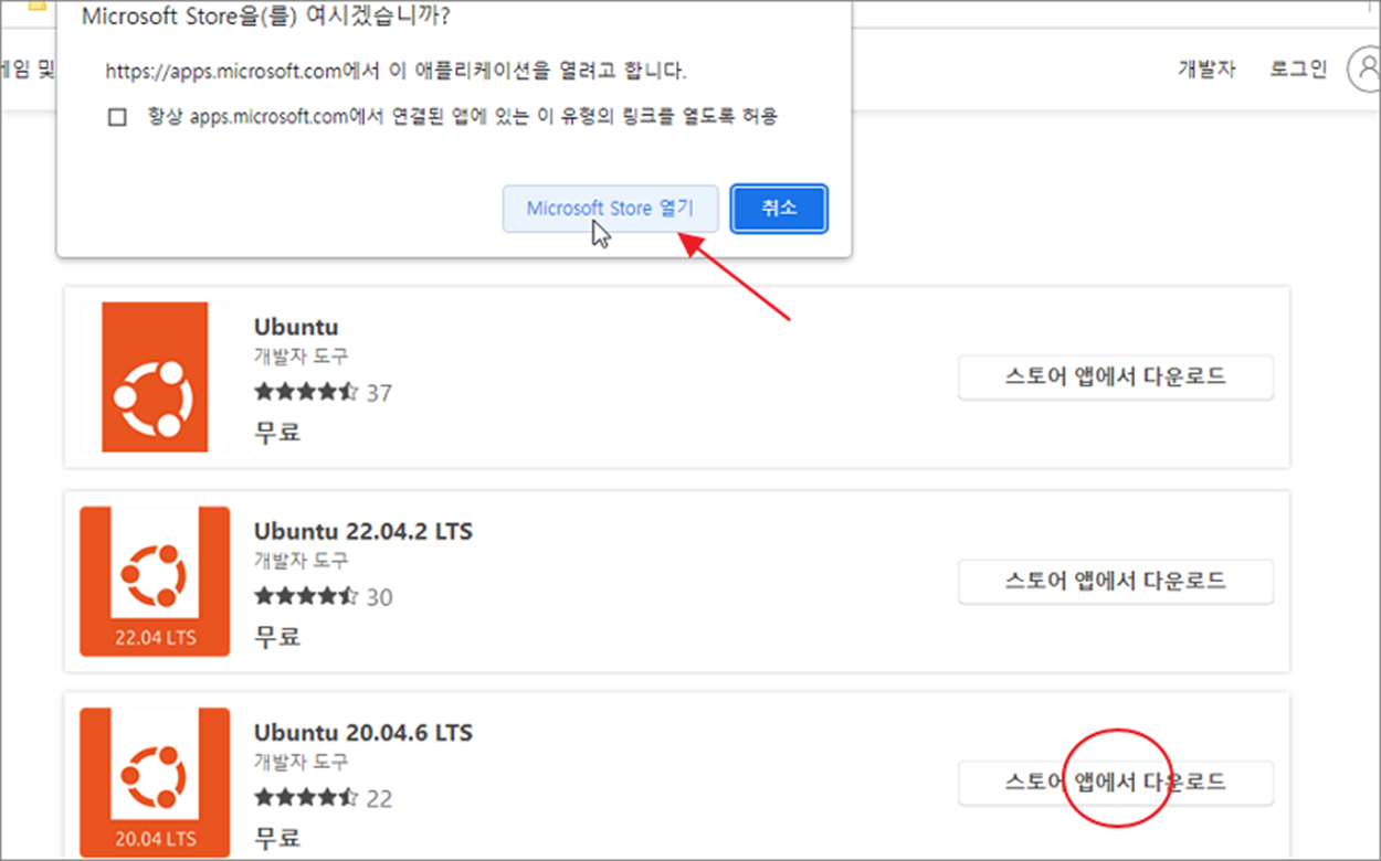 ▼ 스토어 앱에서 다운로드 버튼을 누르면 그림과 같은 상단 스크립트 창이 뜰 겁니다. Microsoft Store 열기를 눌러 다운로드를 진행합니다.
