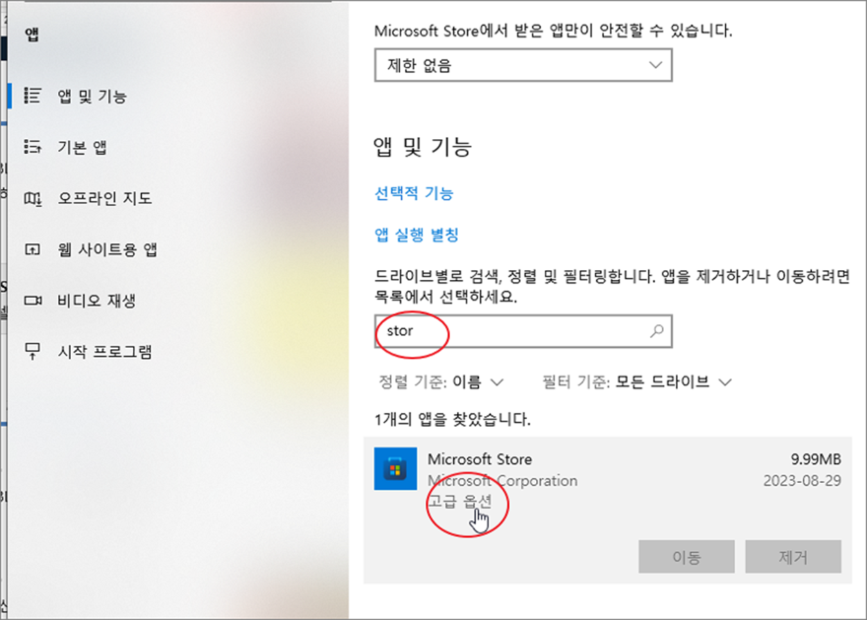 ▼ 스토어 앱이 설치는 되어 있는데 실행에 문제가 있는 경우 고급 옵션을 통해 복구 혹은 초기화를 시도합니다. 설정 > 앱 > 앱 및 기능 설정 페이지로 이동해서 마이크로소프트 스토어 앱을 찾습니다. 그리고 앱 > 고급 옵션 메뉴를 클릭합니다. 고급 옵션 메뉴는 화면이 확장되면서 나타납니다.