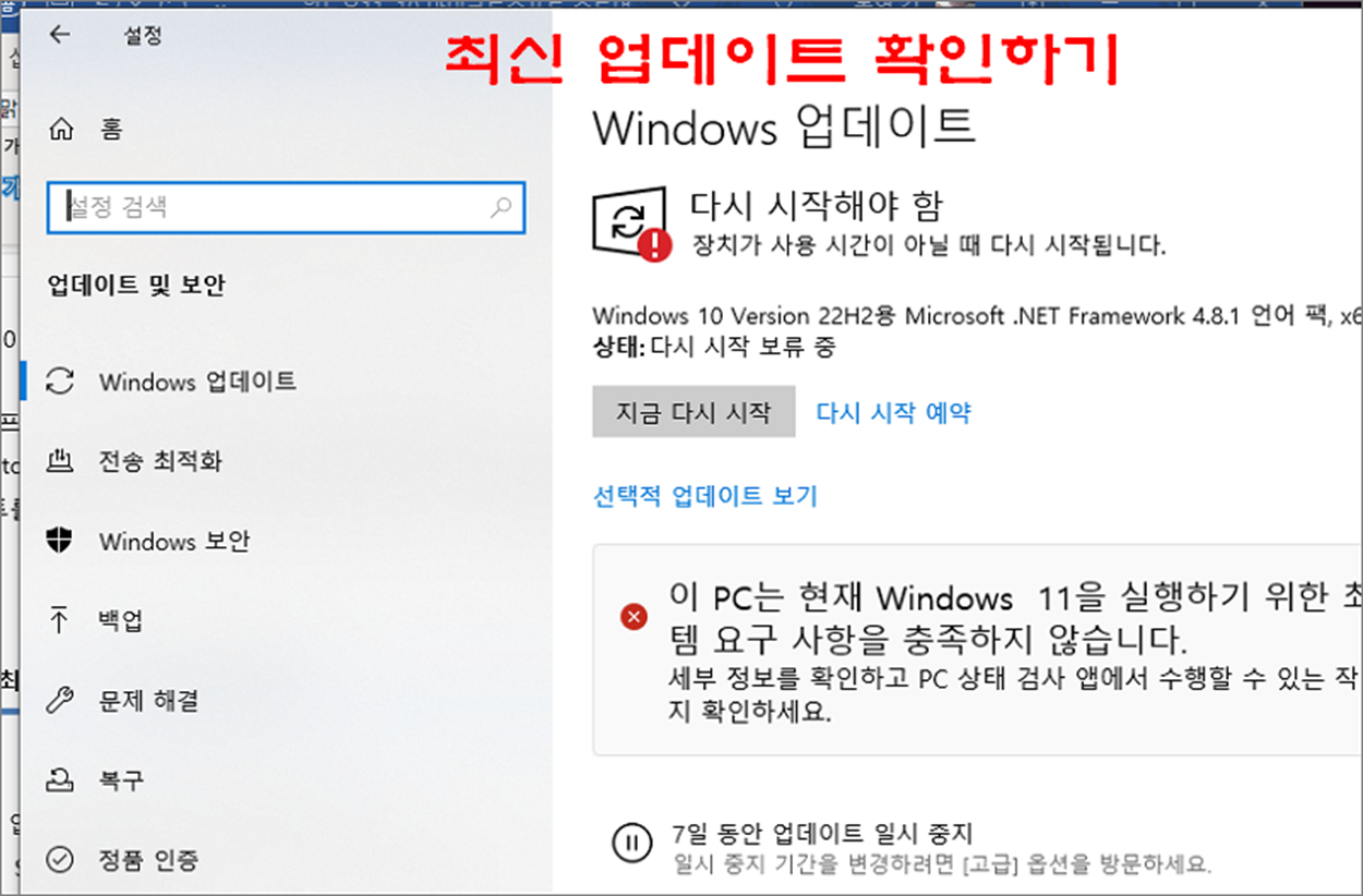 ▼ 설정 > Windows 업데이트 화면으로 가서 최신 업데이트를 확인합니다. 최신 버전으로 업데이트를 하고 다시 시작합니다.