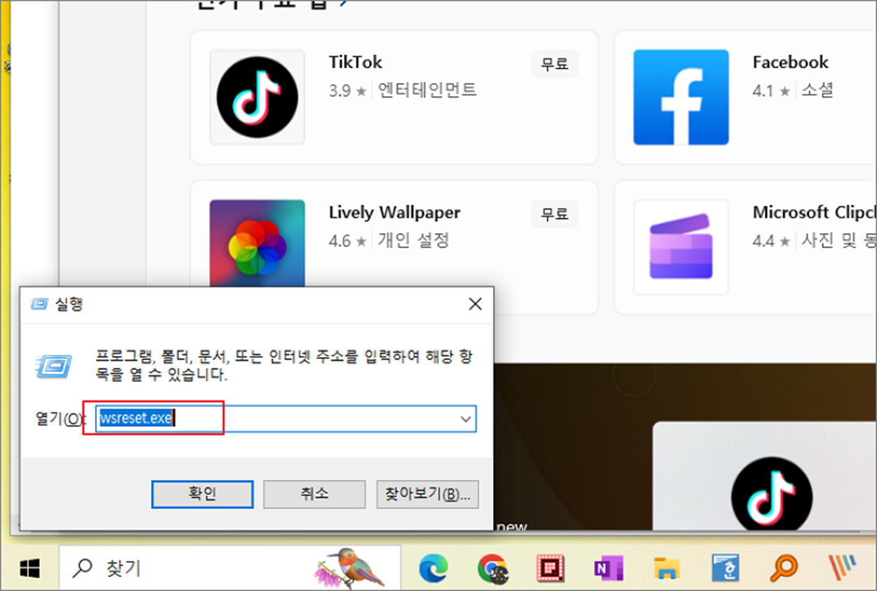 ▼ 윈도우키 + R 을 눌러 실행창을 띄웁니다. wsreset.exe 프로그램을 입력하고 실행합니다. 이것은 마이크로소프트 스토어 앱의 캐시를 초기화 하고 실행할 수 있는 프로그램입니다.
