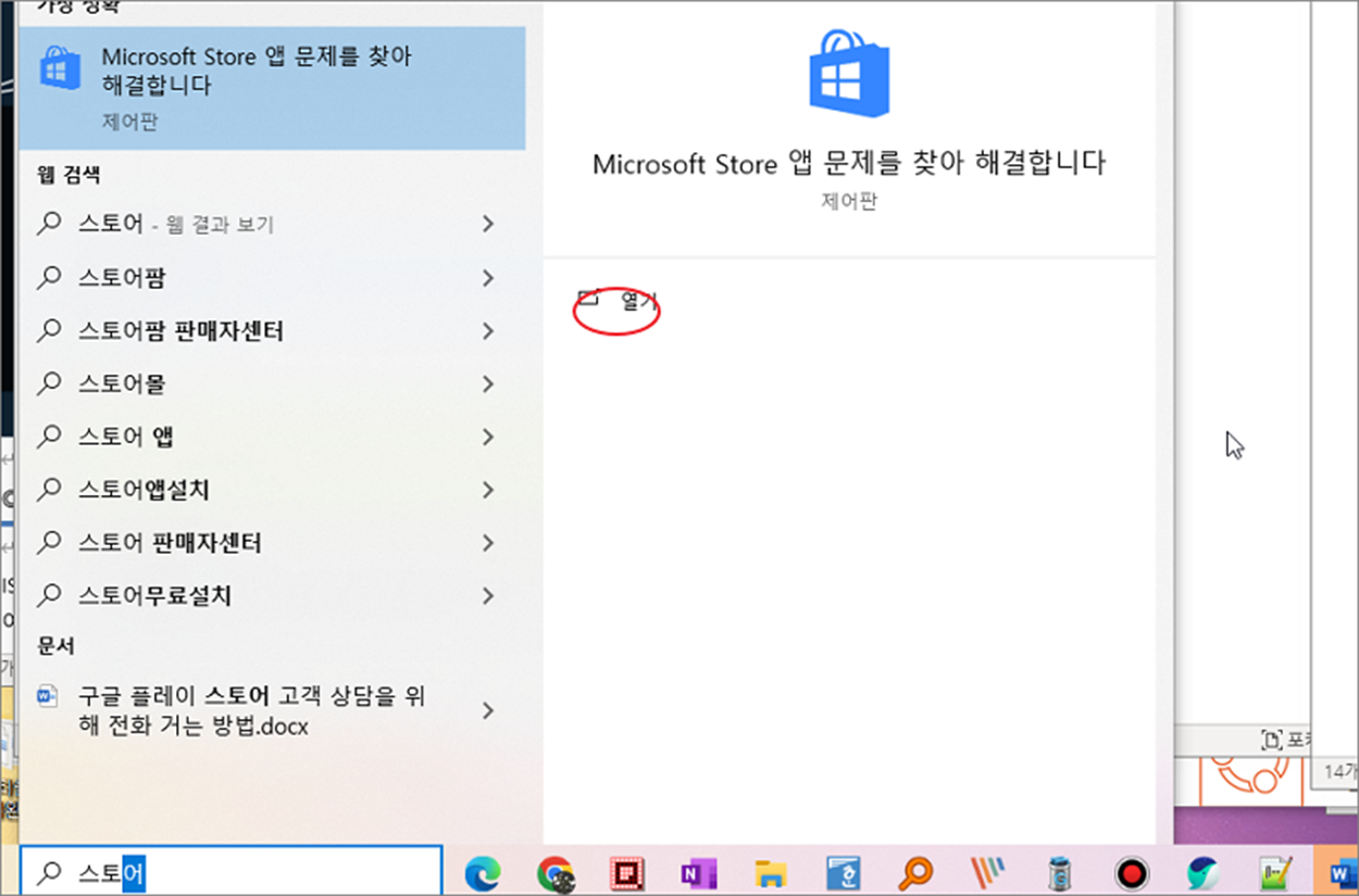 ▼ 그림처럼 앱을 실행하는데 문제가 발생할 수 있습니다. 오른쪽 열기 버튼을 눌러 문제해결 마법사를 띄웁니다.