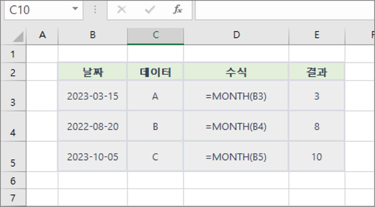 | =MONTH(날짜) l 날짜 : 날짜 데이터, 셀 참조 |