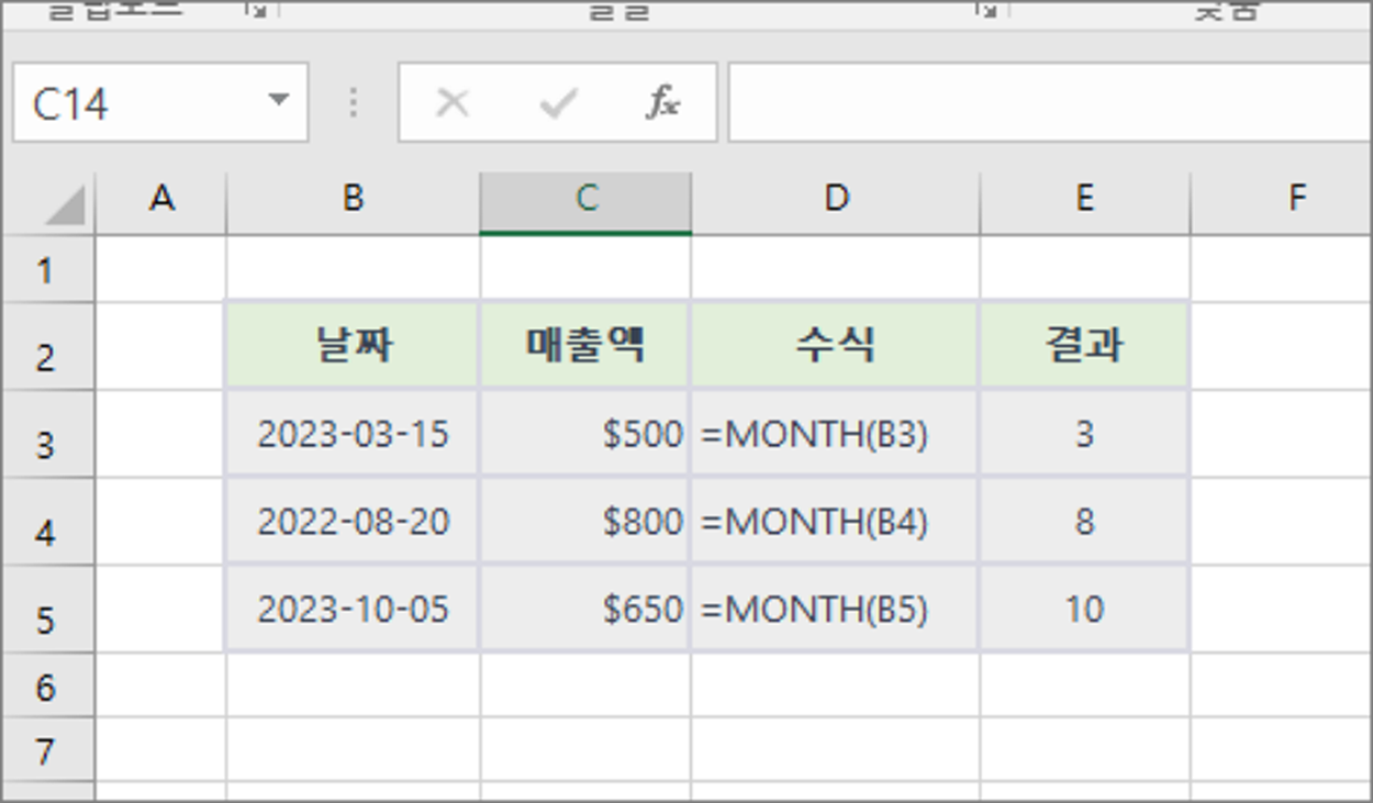 특정 날짜로부터 월을 추출하려면 다음과 같이 'MONTH' 함수를 사용할 수 있습니다: