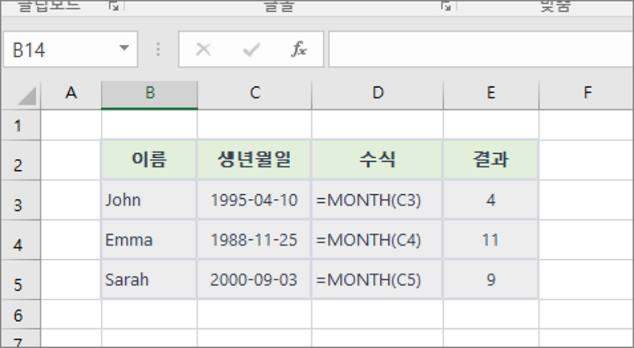 예제에서는 'MONTH' 함수를 사용하여 각 사람의 생일 월을 추출합니다. 각 행에서 이름과 생년월일 데이터가 주어지고, 'MONTH' 함수를 사용하여 생년월일에서 월 정보를 추출합니다. 이를 통해 어떤 월에 가장 많은 사람들이 태어났는지 통계를 분석할 수 있습니다.