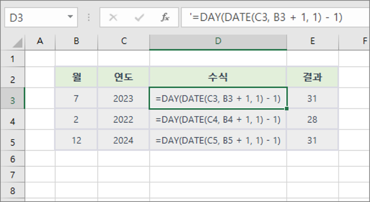 예제에서는 'DAY' 함수와 'DATE' 함수를 결합하여 특정 월의 마지막 일을 계산합니다. 각 행에서 월과 연도 데이터가 주어지고, 'DATE' 함수로 해당 월의 다음 달 1일을 구한 후 'DAY' 함수를 사용하여 1을 빼서 마지막 일을 얻습니다.
