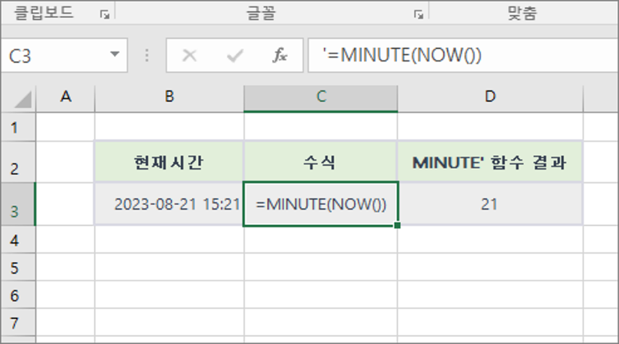 현재 시간 "2023-08-21 15:21"에서 'MINUTE' 함수를 사용하여 분 부분을 추출하여 21을 반환합니다.