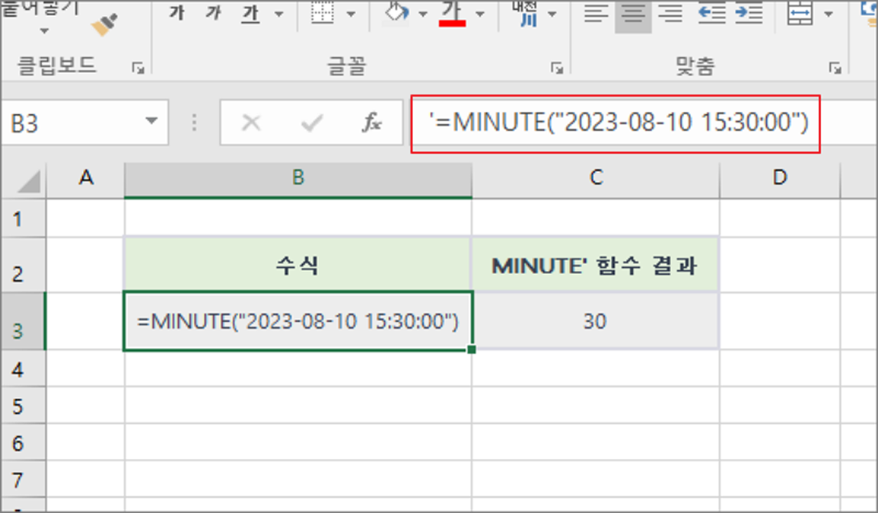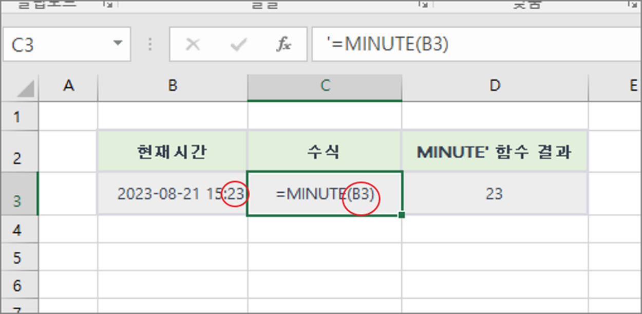 다른 셀에 있는 날짜와 시간 "2023-08-21 15:23"에서 'MINUTE' 함수를 사용하여 분 부분을 추출하여 23 를 반환합니다.