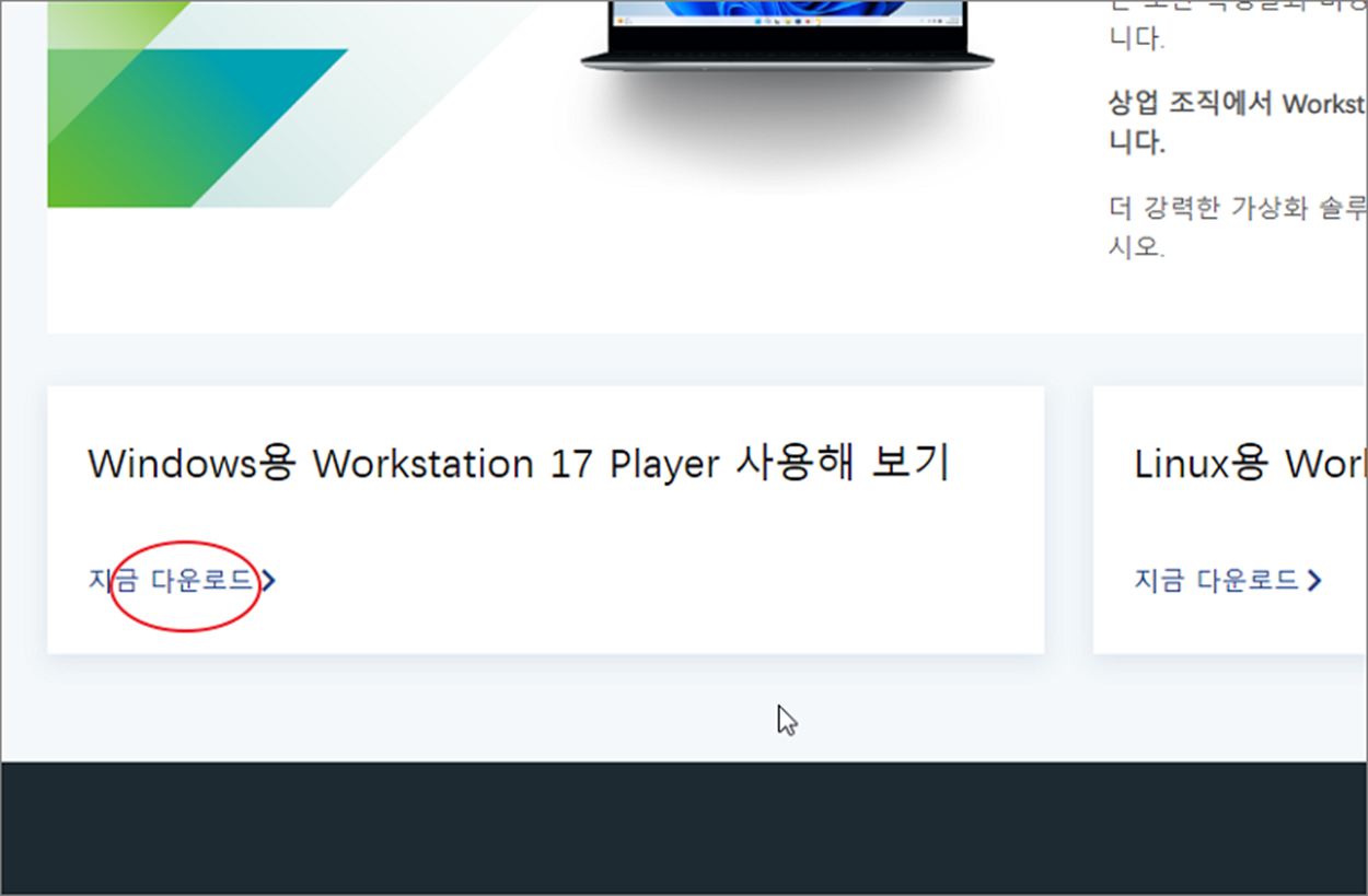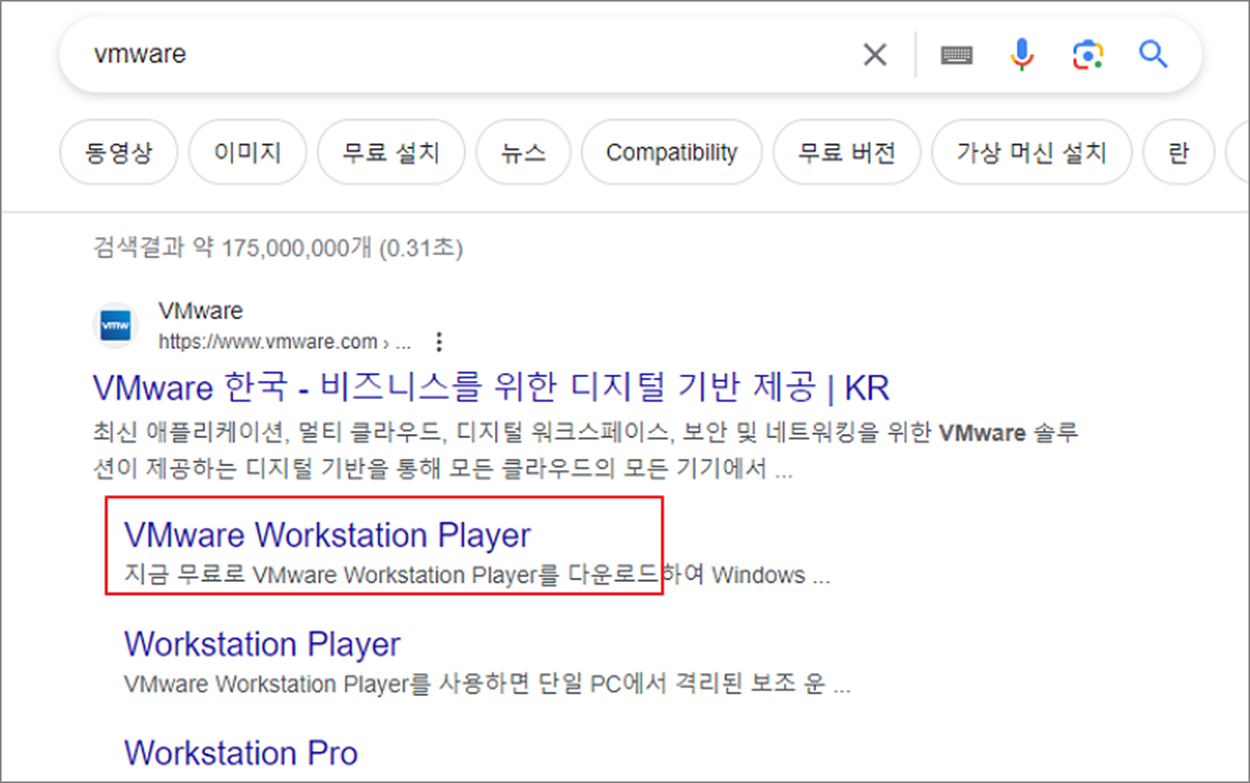 ▼ 구글 검색엔진에서 VMWare 로 검색합니다. 제일 상단에 VMware Workstation Player 링크를 클릭합니다.