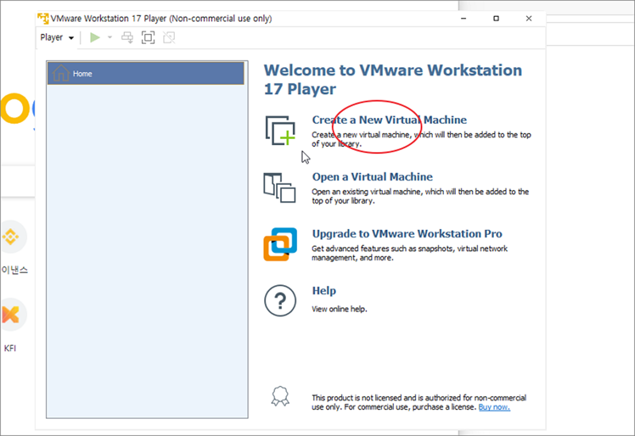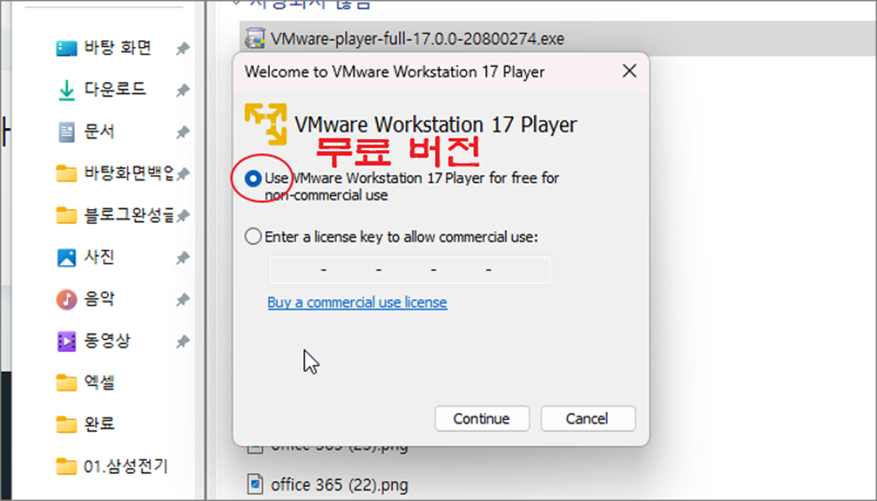 ▼ 프로그램 실행 첫 화면에서 두 가지 옵션 중 하나를 선택해야 합니다. 상업적 용도가 아닌 무료로 사용하고 싶다면 상단 Use VMWare Workstation 17 Player for free for non-commercial use 를 선택하고 Continue 버튼을 클릭합니다.