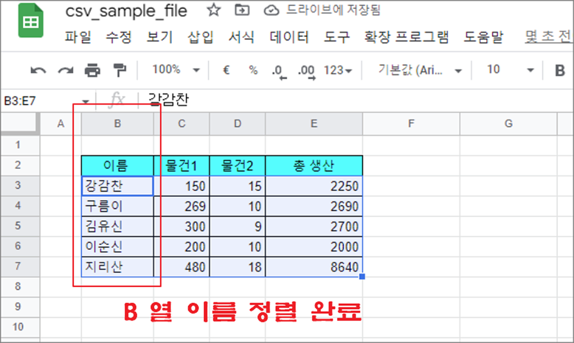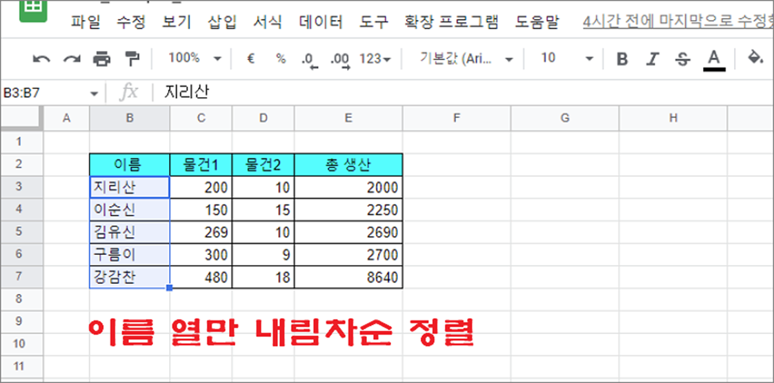 ▼ 다른 열에는 영향을 주지 않고 “이름” 열만 정렬을 완료했습니다.