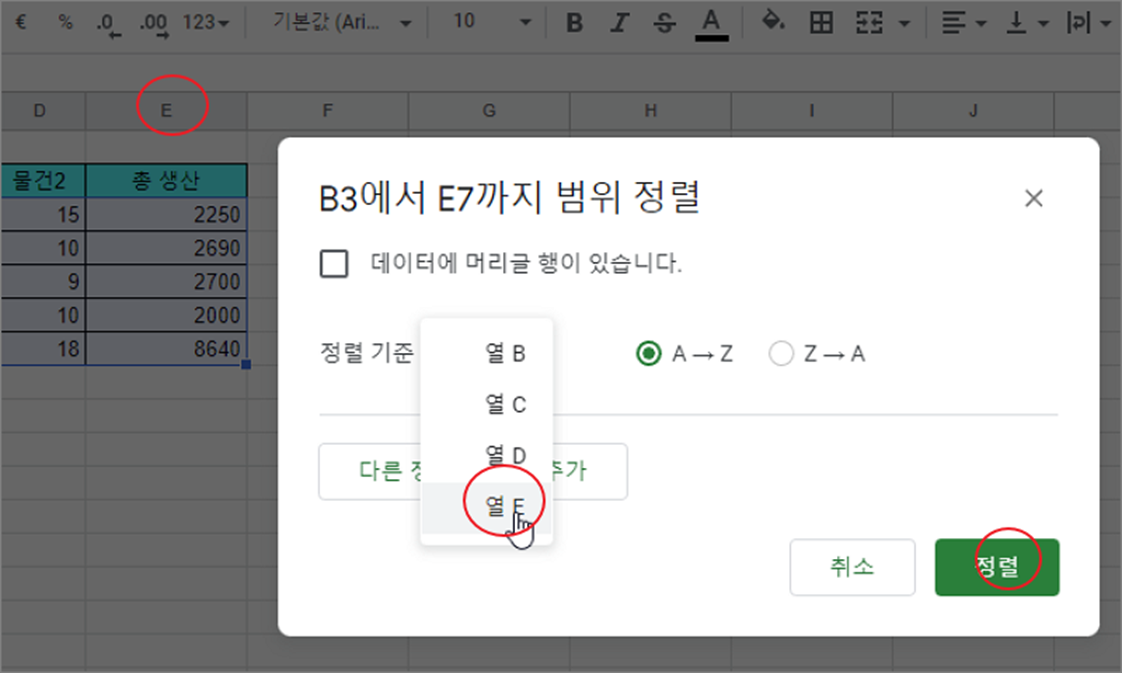 ▼ 정렬 옵션 창에서 정렬 기준을 원하는 열로 변경합니다. 다음 아래로 내려가 정렬 버튼을 클릭합니다.