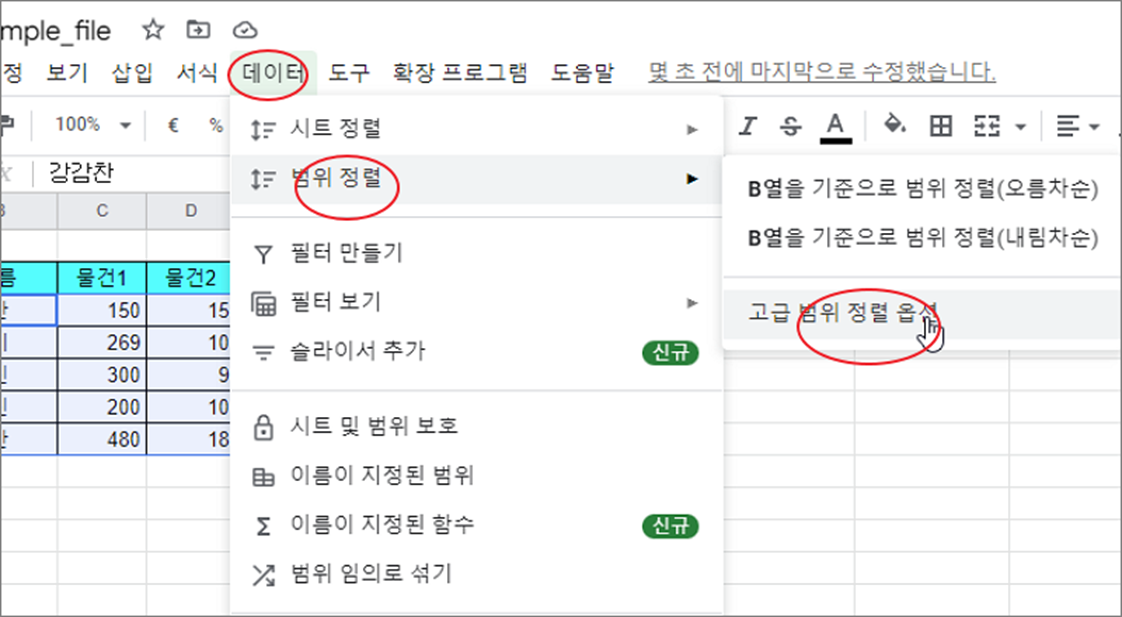 ▼ 다음은 셀 선택과 상관없이 정렬 기준을 변경해 보겠습니다. 정렬하고 싶은 셀을 선택하고 데이터 > 범위 정렬 > 고급 범위 정렬 옵션 메뉴를 클릭합니다.