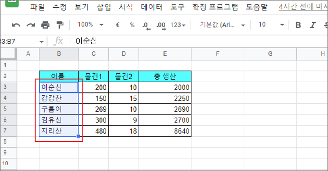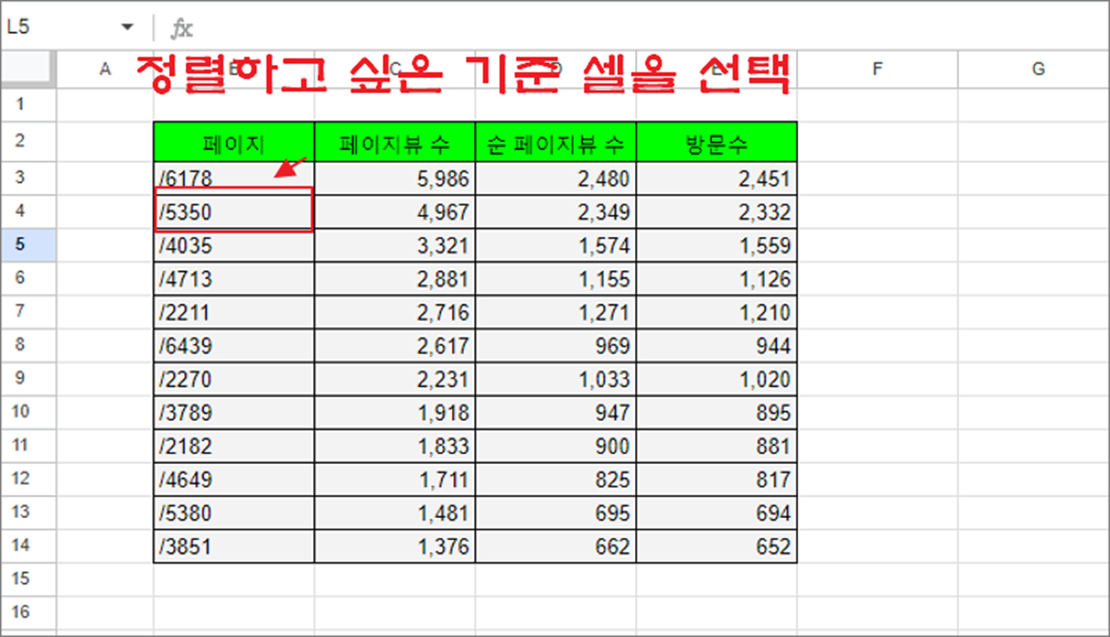 ▼ 먼저 정렬 기준이 되는 셀을 선택합니다. 열 기준으로 오름차순 정렬을 할 것이기 때문에 B 열 중 아무 셀이나 선택합니다.