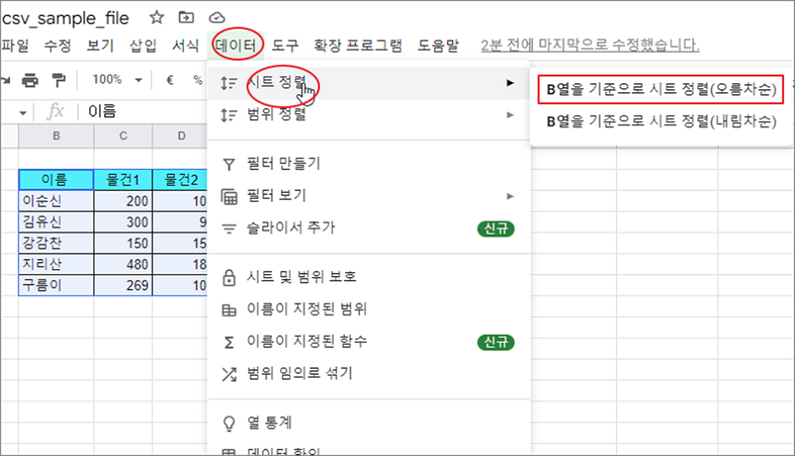 ▼ 상단 데이터 > 시트 정렬 에서 오름차순/내림차순 중 하나를 선택합니다.