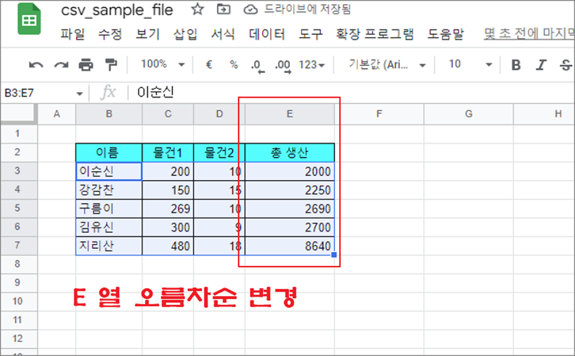 ▼ 결과는 다음과 같습니다. E 열을 기준으로 오름차순 정렬을 완료했습니다.