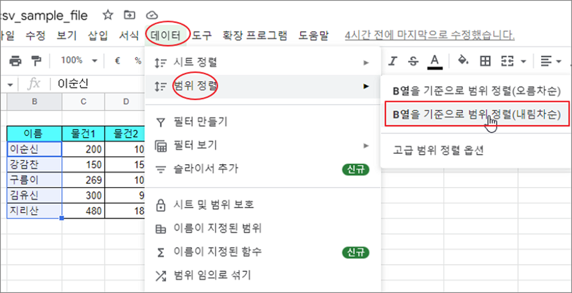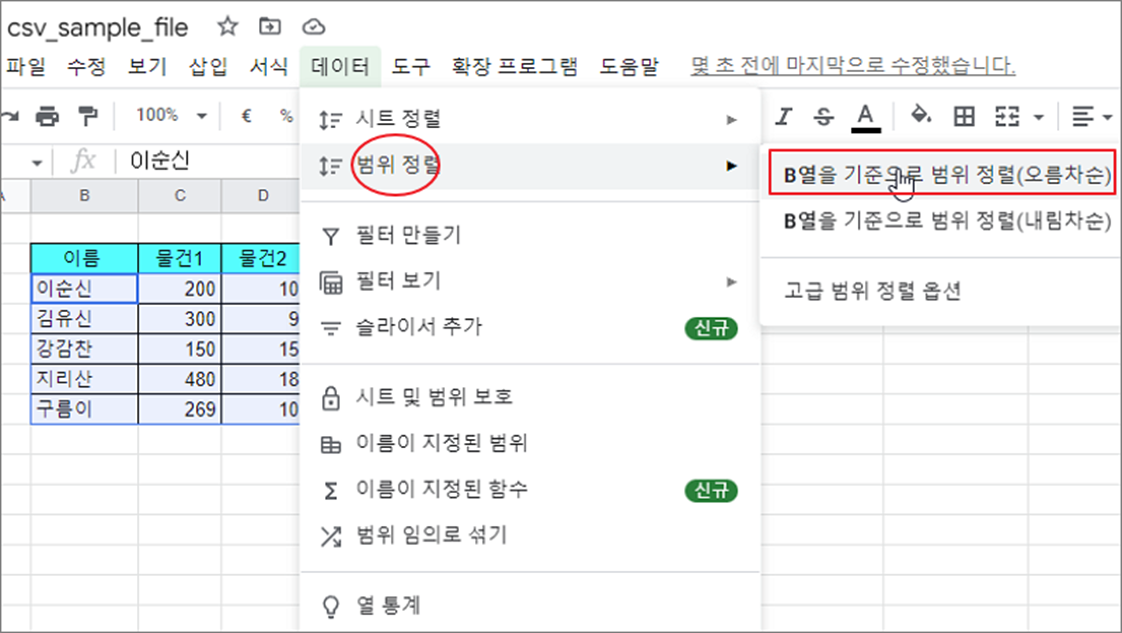 ▼ 특정 범위만 정렬하고 싶다면 데이터 > 범위 정렬 을 이용해야 합니다. 이번에는 정렬하고 싶은 영역을 모두 선택하고 데이터 > 범위 정렬 > 오름차순/내림차순 중 하나를 클릭합니다.