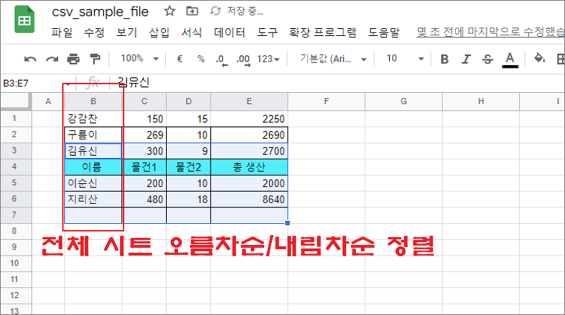 ▼ 그림처럼 시트 정렬은 특정 범위가 아닌 시트 전체를 대상으로 정렬하기 때문에 상단 공백을 제거하고 B 열을 기준으로 오름차순 정렬을 했습니다.