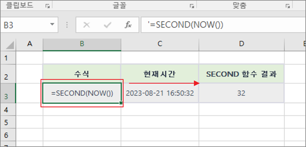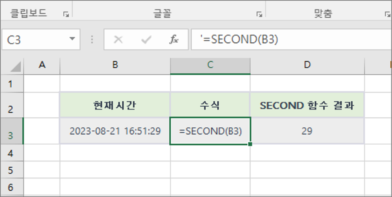 다른 셀에 있는 날짜와 시간 "2023-08-21 16:51:29"에서 SECOND 함수를 사용하여 초 부분을 추출하여 29을 반환합니다.