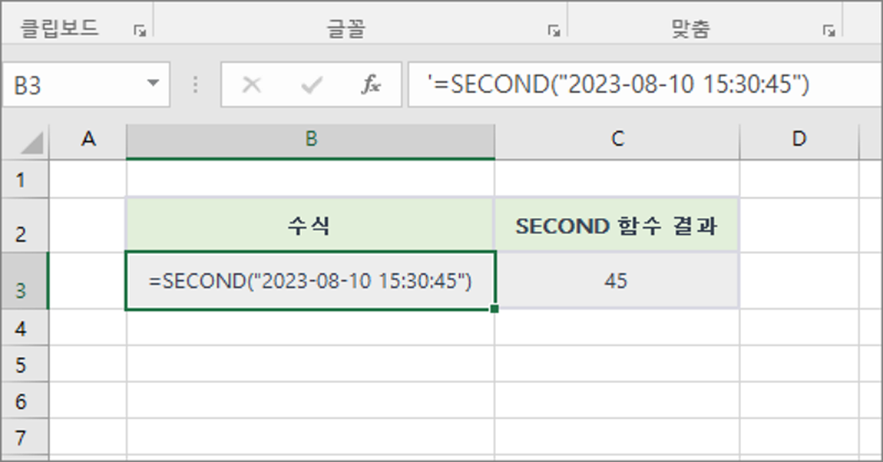 주어진 날짜와 시간 "2023-08-10 15:30:45"에서 SECOND 함수를 사용하여 초 부분을 추출하여 45를 반환합니다.