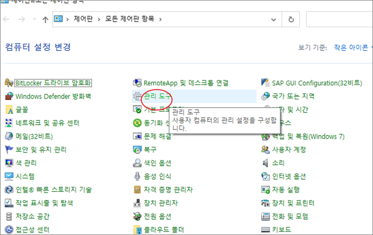 ▼ 제어판에서 관리 도구 메뉴를 찾아 클릭합니다. 관리 도구는 컴퓨터 설정을 관리하는 설정창을 열 수 있는 바로가기 아이콘이 나타납니다.