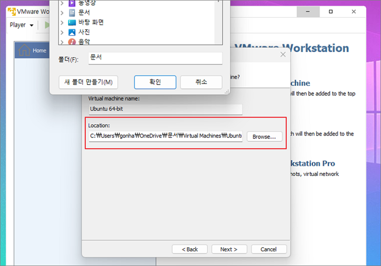 ▼ 세 번째 화면에서는 VMWare 관리 파일이 저장될 곳을 지정해야 합니다. 해당 파일은 우분투에 프로그램을 설치하고 파일을 추가하는 등 저장 공간이 늘어나면 사이즈가 커지기 때문에 OS 가 설치된 C 드라이브보다는 데이터를 관리하는 별도의 공간에 위치하는 것이 좋습니다.