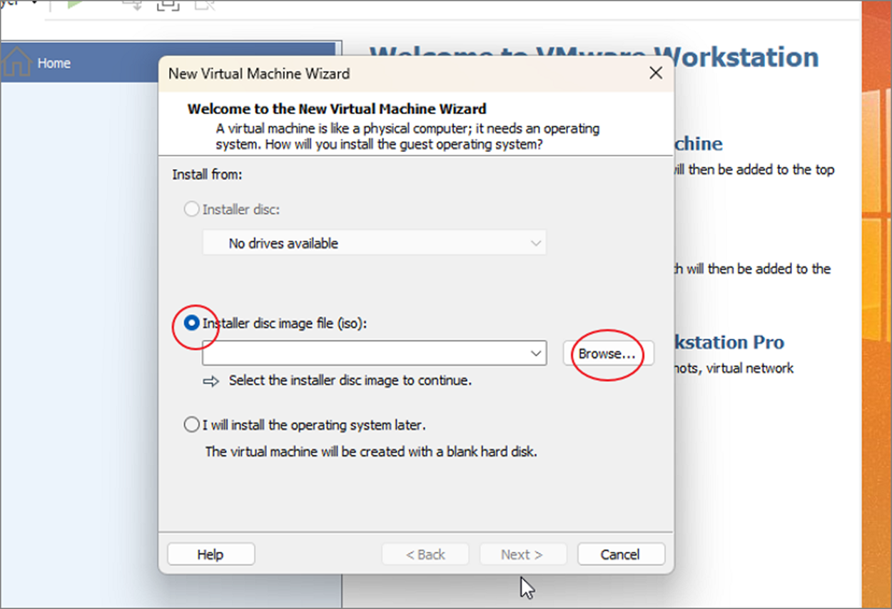 ▼ 다음 화면에서 Installer disc image file 옵션을 선택합니다. 그리고 오른쪽 Browse 버튼을 클릭합니다. 이전에 다운받은 우분투 ISO 파일을 추가하기 위해서입니다.