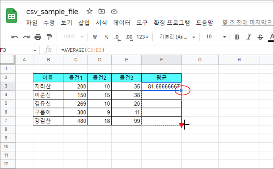 ▼ AVERAGE 함수로 평균을 구했다면 나머지 셀도 채우기 핸들을 이용해서 아래로 내려 적용합니다.