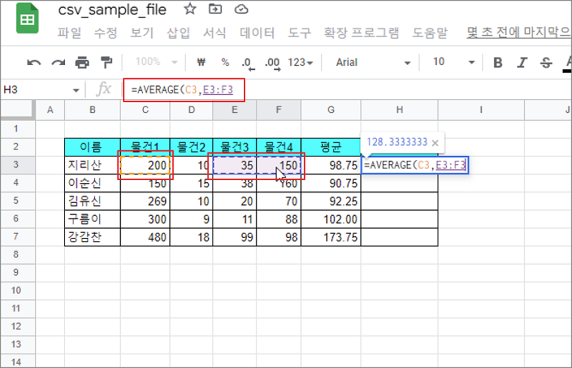 ▼ 다음은 부분 영역의 평균을 구하는 방법입니다. 연속된 셀이 아닌 떨어져 있는 영역을 모두 추가해서 평균을 구할 수 있습니다. 그림처럼 “물건2” 는 제외하고 떨어진 나머지 두 영역의 평균을 구하고 있습니다.