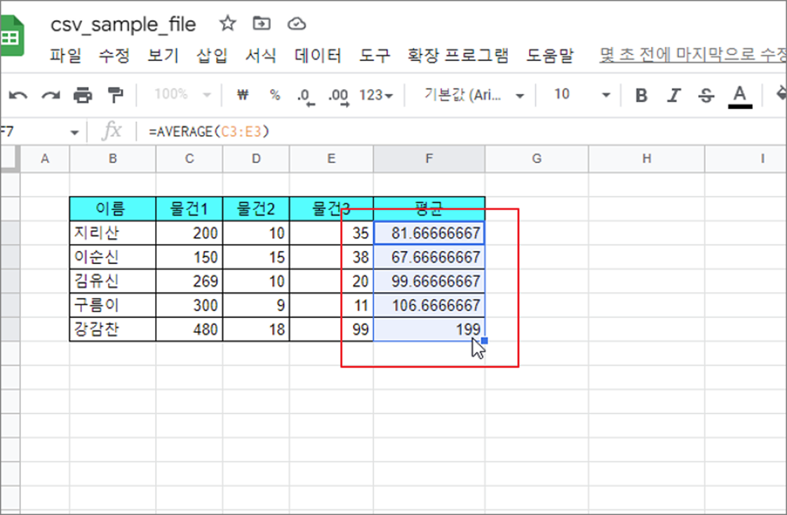 ▼ 결과는 다음과 같습니다. 모든 셀에 평균 값을 구했습니다.