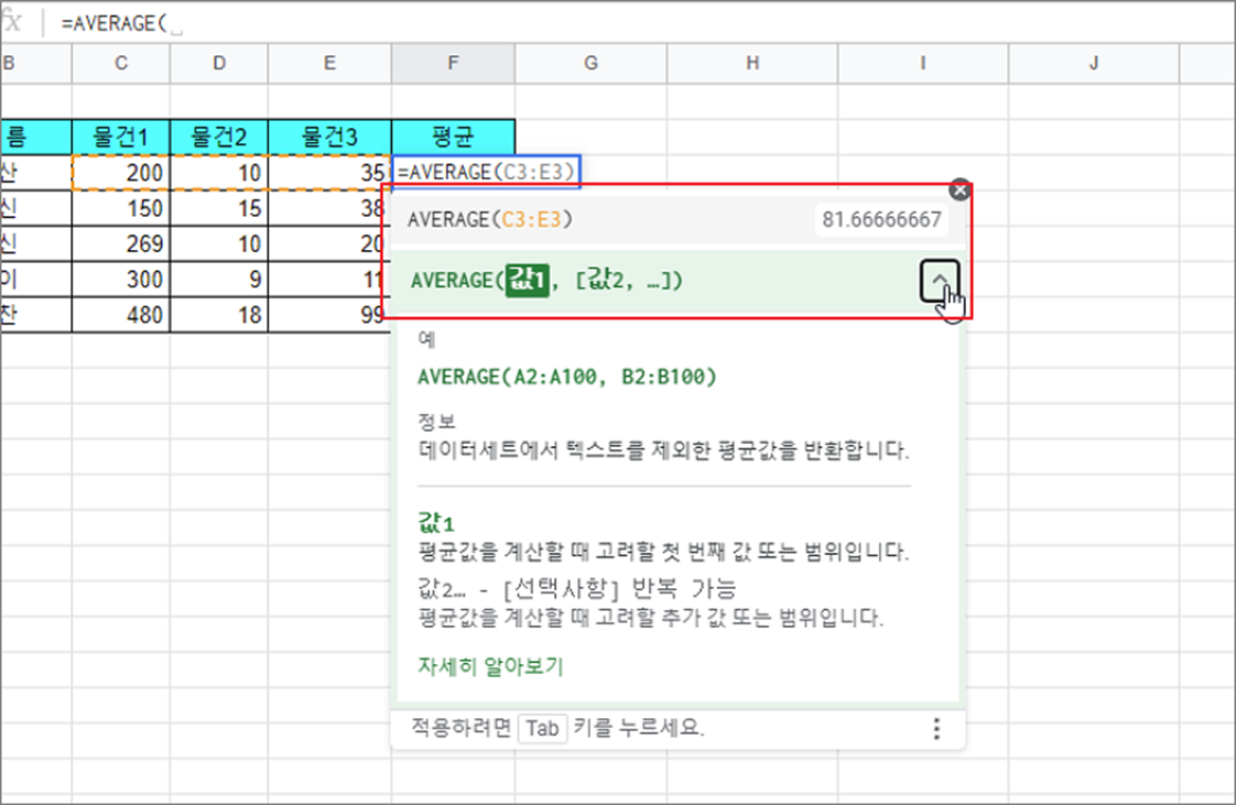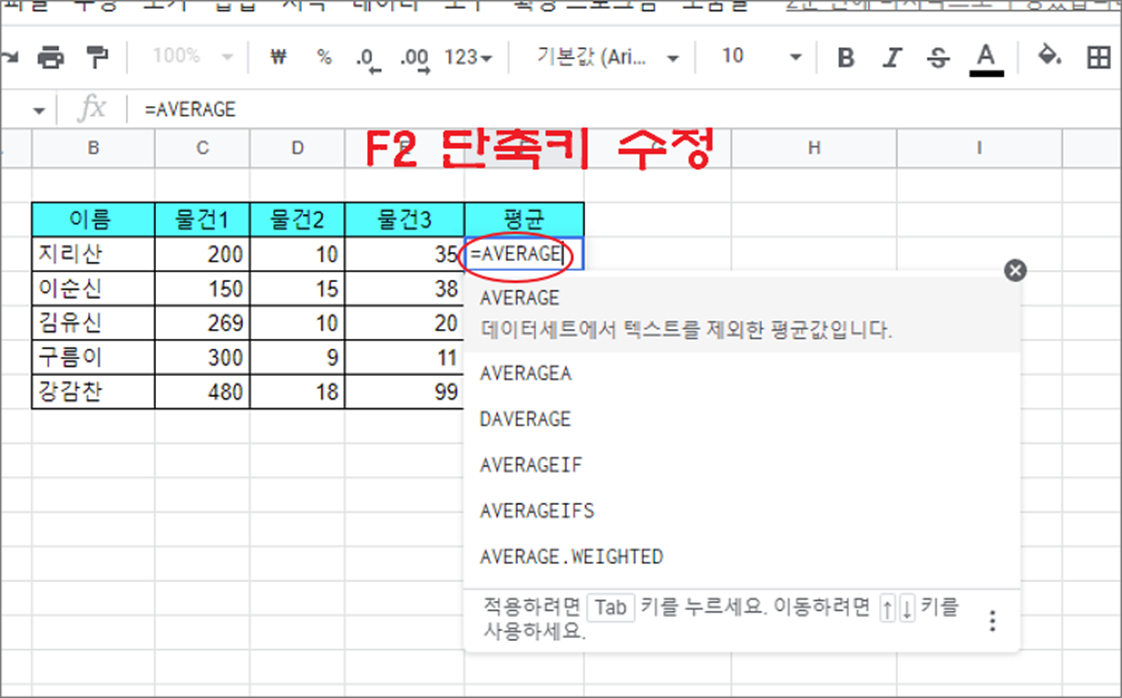 ▼ 샘플에서는 3개의 물건 값에 대한 평균을 구하기 위해 AVERAGE 함수를 사용합니다. 그림처럼 셀에 =AVERAGE 라고 입력하면 추천 함수 목록이 뜹니다.