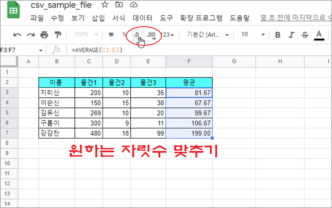 ▼ 하지만 평균 데이터의 소수점이 길어서 두 자리로 정리하려 합니다. 상단 소수점 이하 자리수 감소 버튼을 눌러 모든 숫자의 소수점이 2자리가 될 때까지 클릭합니다.