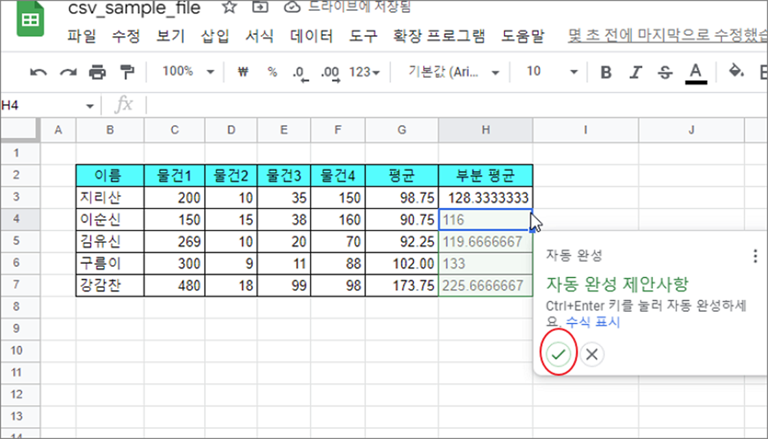 ▼ 자동 완성 기능을 이용해서 나머지 셀도 모두 부분 평균 식을 적용합니다.