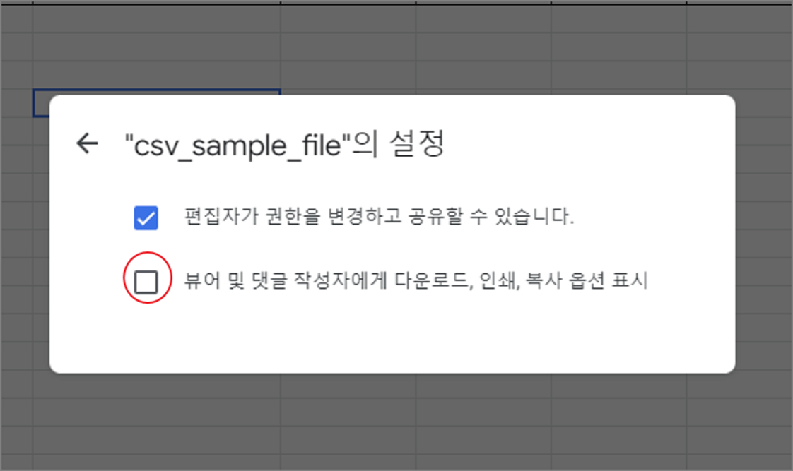 ▼ 공유자에게 두 가지 기능을 부여할 수 있습니다. 공유자의 권한은 처음에 이야기했듯이 편집자, 뷰어, 댓글 작성자 3가지 인데, 뷰어와 댓글 작성자가 문서를 다운로드, 인쇄, 복사 할 수 있도록 설정할 수 있습니다.