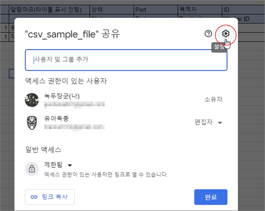 ▼ 공유 설정창이 뜨면 오른쪽 끝에 톱니바퀴 모양의 설정 아이콘을 클릭합니다.