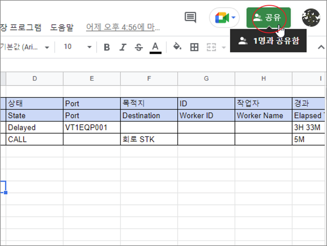 ▼ 먼저 문서를 소유하고 있는 사용자의 설정을 알아보겠습니다. 공유가 필요한 문서를 연 후 오른쪽 상단 공유 버튼을 클릭합니다.
