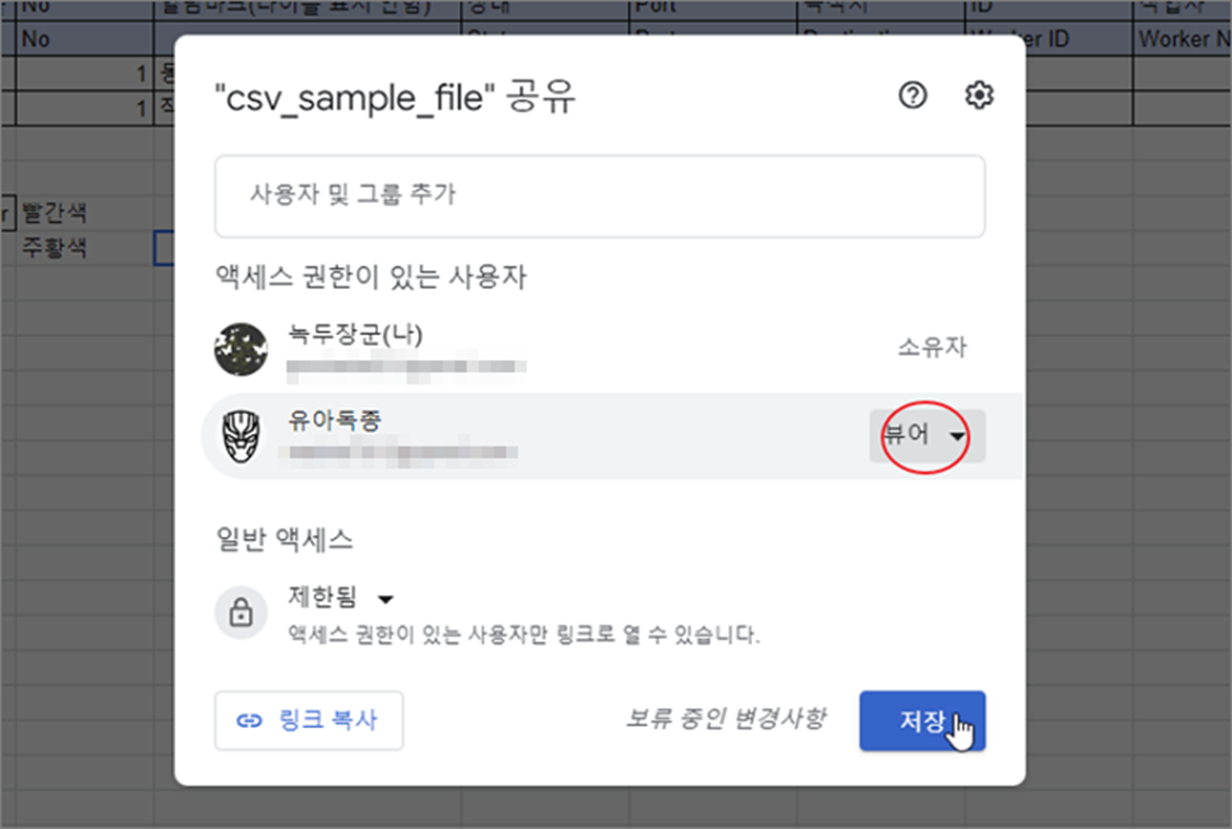 ▼ 이제 옵션 설정이 끝났고 원하는 사용자에게 문서 공유 설정을 해 보겠습니다. 사용자 및 그룹 추가 란에서 사용자를 목록에 추가합니다. 사용자 목록에서 오른쪽 끝에 옵션을 선택합니다. 옵션 종류는 3가지로 편집자, 뷰어, 댓글 작성자 입니다.