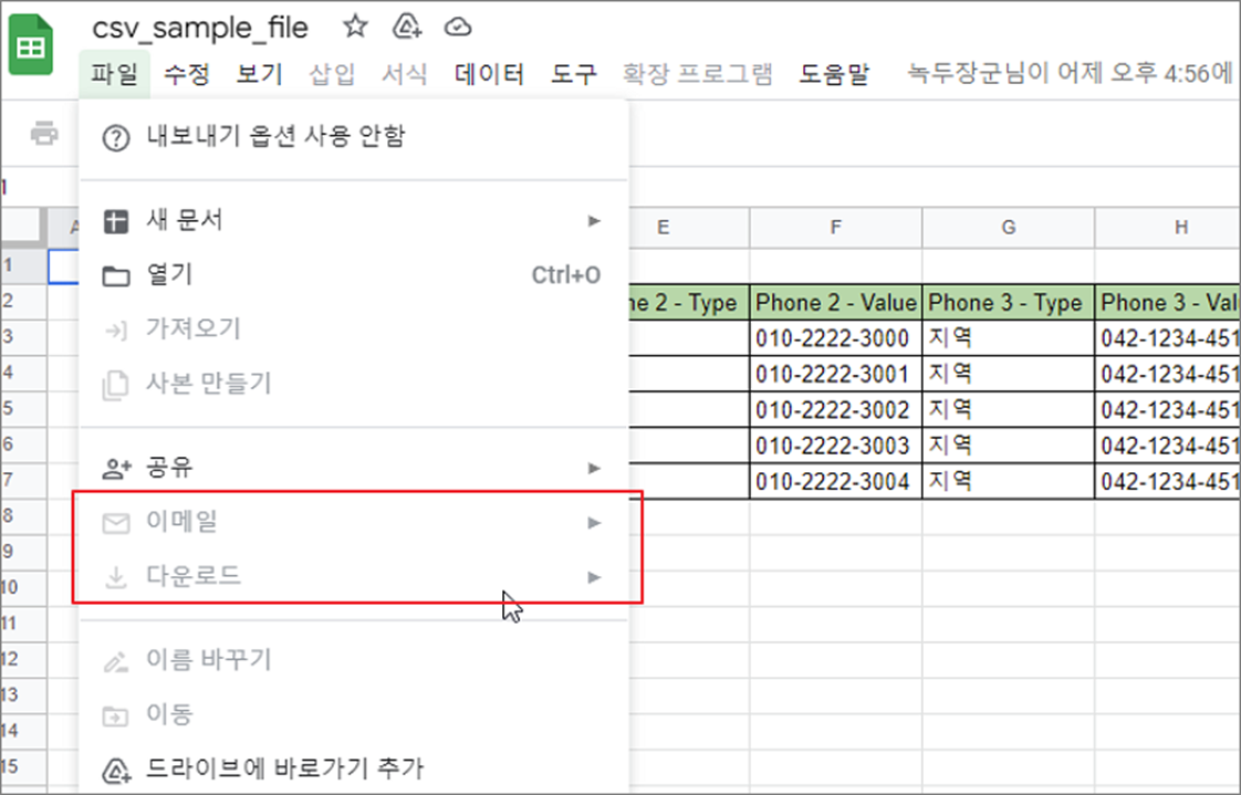 ▼ 그림처럼 공유 받은 사람은 “뷰어” 옵션으로 공유 받았기 때문에 메뉴에서 다운로드와 이메일이 비활성화가 된 것을 알 수 있습니다.