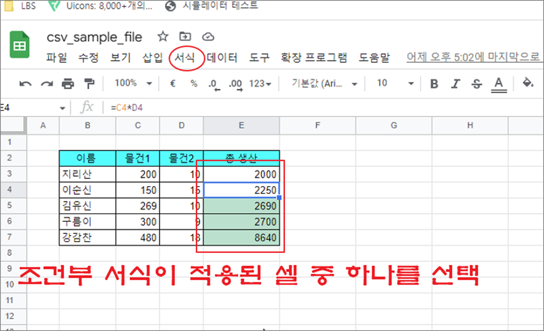 ▼ 다음은 셀에 적용된 조건부 서식을 삭제해 보겠습니다. 조건부 서식이 적용된 셀을 하나 선택합니다. 그리고 상단 서식 메뉴를 클릭합니다.