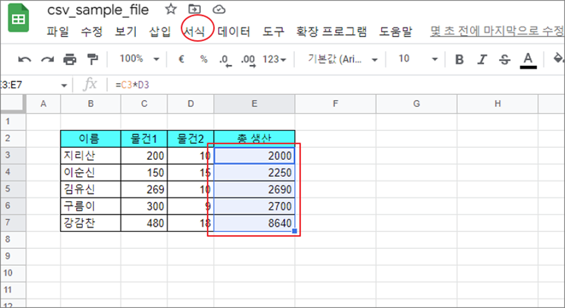 ▼ 조건부 서식 메뉴는 상단 서식 에 있습니다. 조건부 서식을 적용할 영역을 선택하고 서식 메뉴를 클릭합니다.