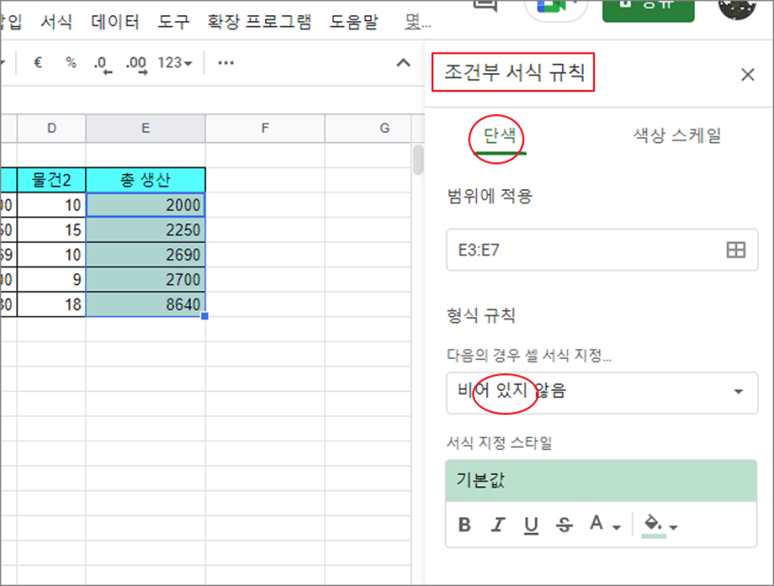▼ 오른쪽에 조건부 서식 규칙 설정 창이 나타납니다. “단색” 탭을 선택하고 “형식 규칙” 항목으로 갑니다. 그리고 바로 아래 조건을 지정합니다. “비어 있지 않음” 콤보 박스를 클릭합니다.